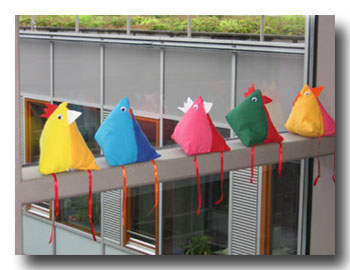 In diesem Sinne können auch die gezeigten Arbeiten verstanden werden, die vom Erdgeschoss bis zum 2. Stock zu sehen sind. Die Niederscheyerer Schüler sind nicht nur passionierte Maler, sie töpfern und nähen genauso gern, wie sie Holz und Ton bearbeiten. Kleine getöpferte Vögel, die auf Birkenästen sitzen und vom Innenhof neugierig in die Gänge des Finanzamts spitzen, stellen dies genauso unter Beweis wie aus Holz gefräste und bemalte Butler, auf denen auch mal etwas liegen bleiben kann.